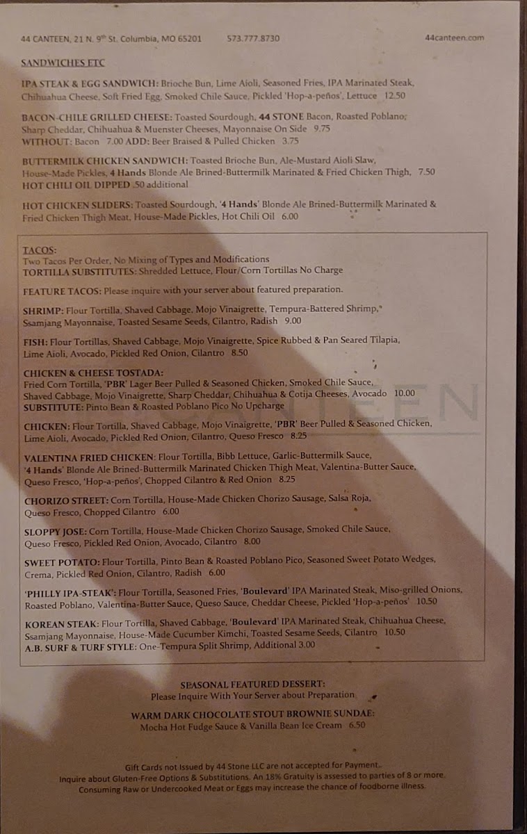 Nestled in downtown Columbia, MO, 44 Canteen offers a vibrant culinary experience worth exploring. Their menu is a delightful assortment of dishes, perfect for any palate. Start with the Canteen Nachos, featuring seasoned tortilla chips topped with rich queso and smoky chile sauce, or opt for the Tortilla Chips & Dips for a customizable dip experience.